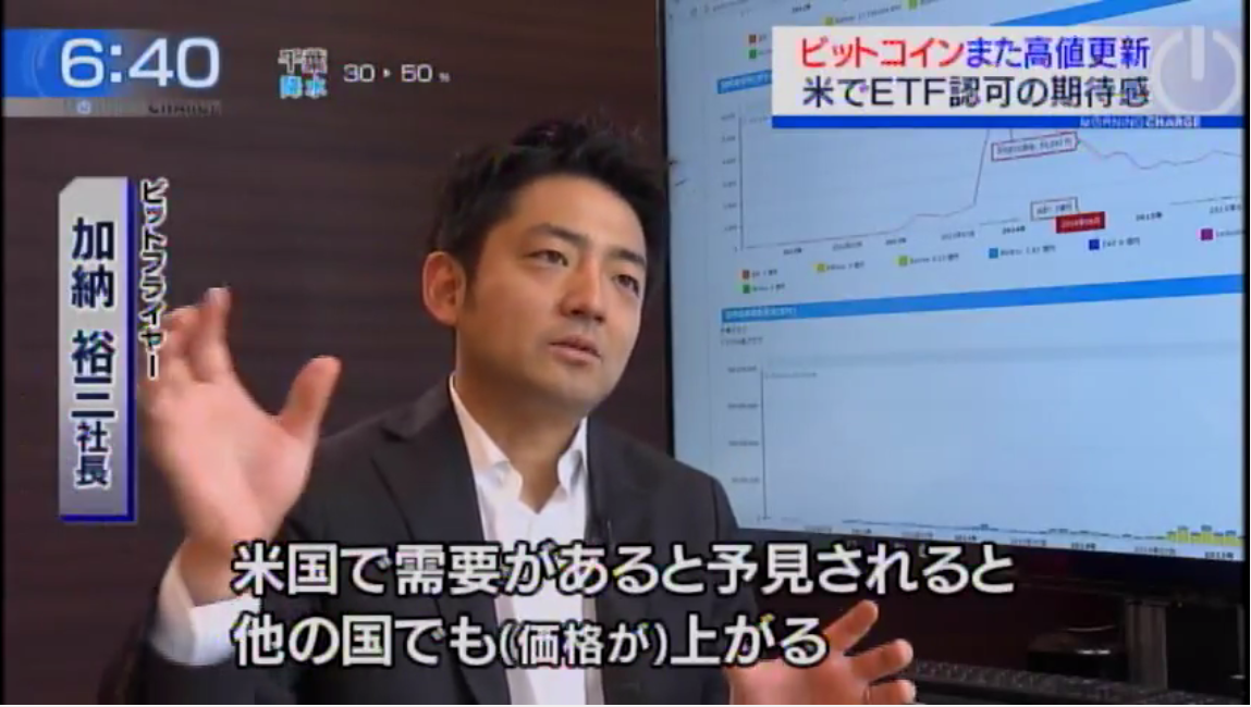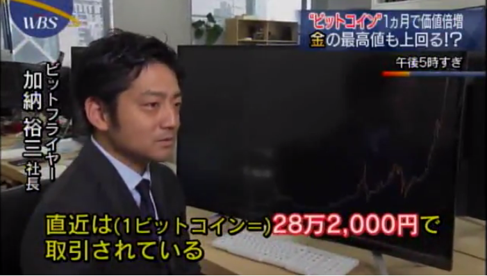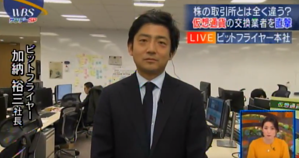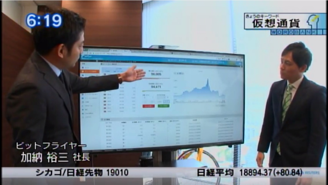 TV東京モーニングサテライトの仮想通貨特集で弊社が紹介されました TV東京モーニングサテライトの仮想通貨特集で弊社代表加納のインタビュー、ビットコイン売買の実演等が放送されました。 2017-01-19