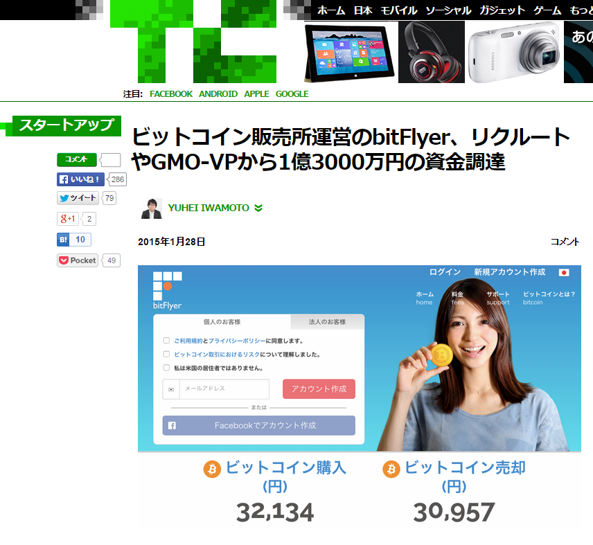 TechCrunch記事「ビットコイン決済が身近に、bitFlyerがビックカメラ2店、Coincheckが26万店展開のAirレジで」で当社とビックカメラの取組が紹介されました お店でビットコインを使って買い物をすることが、ごく近い将来に普通の光景になるかもしれない。2017年4月5日、家電量販大手ビックカメラが旗艦2店舗でbitFlyerのビットコイン決済の導入を発表した。 2017-04-05
