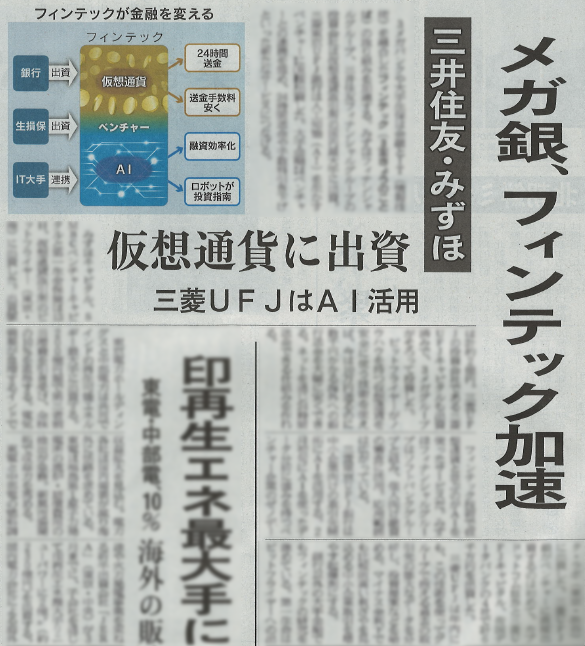 日経新聞記事「メガ銀、フィンテック加速」で弊社の資金調達が取り上げられました 3メガバンクや大手生保は金融とIT(情報技術)を融合したフィンテックの取り組みを加速する。みずほフィナンシャルグループ、三井住友フィナンシャルグループの投資会社は仮想通貨取引所の国内最大手に出資。三菱東京UFJ銀行は人工知能(AI)を生かすベンチャーに直接出資した。 2017-02-14