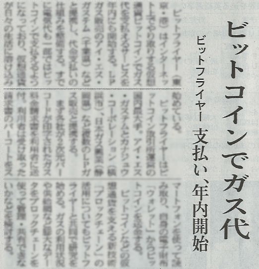 日経新聞記事「ビットコインでガス代 ビットフライヤー 支払い、年内開始」で当社の取組が紹介されました ビットフライヤー(東京・港)はインターネット上でやり取りする仮想通貨ビットコインでガス代を支払えるサービスを年内にも開始する。 2017-04-20