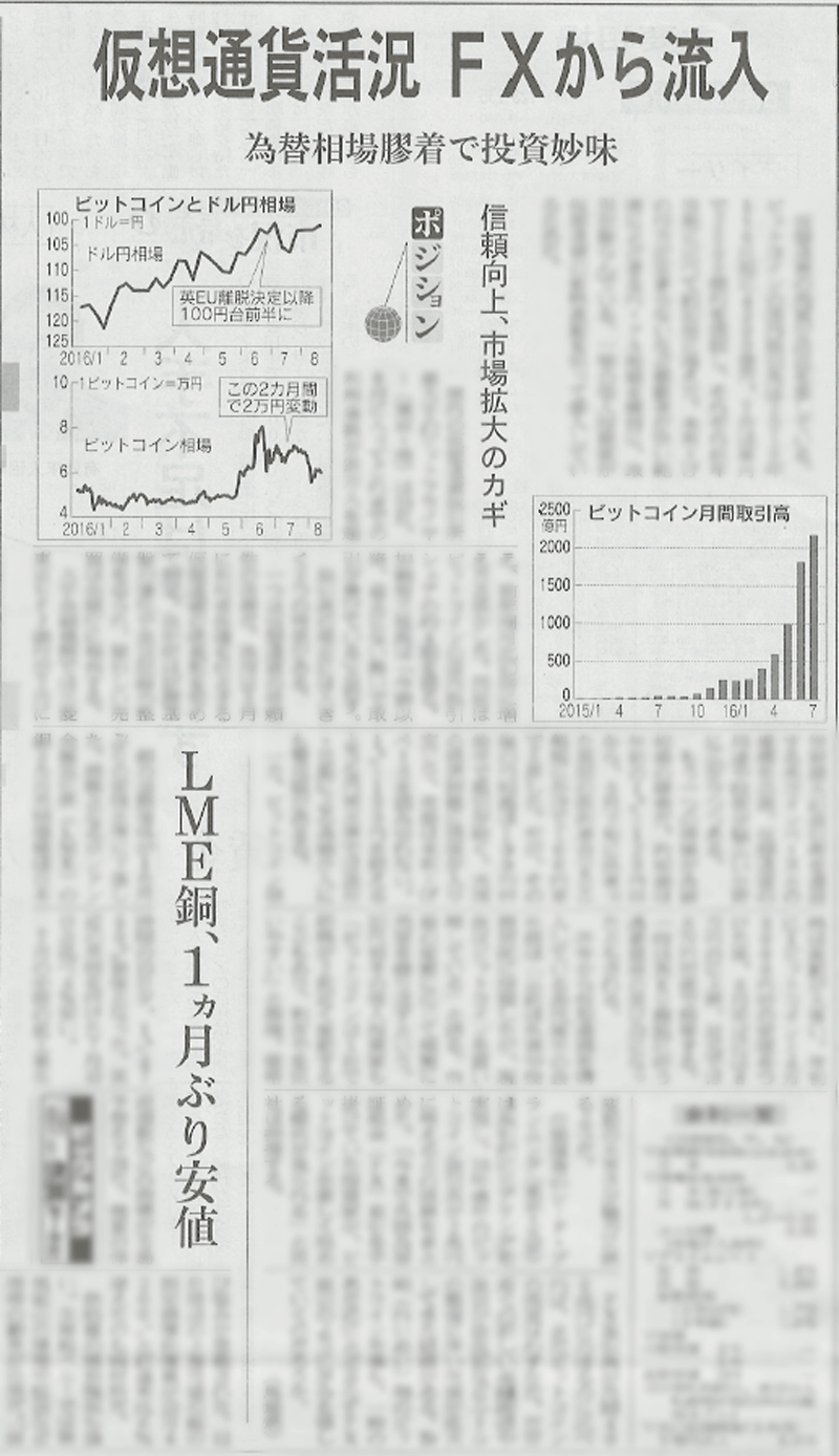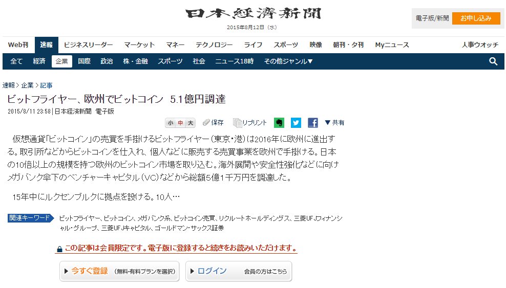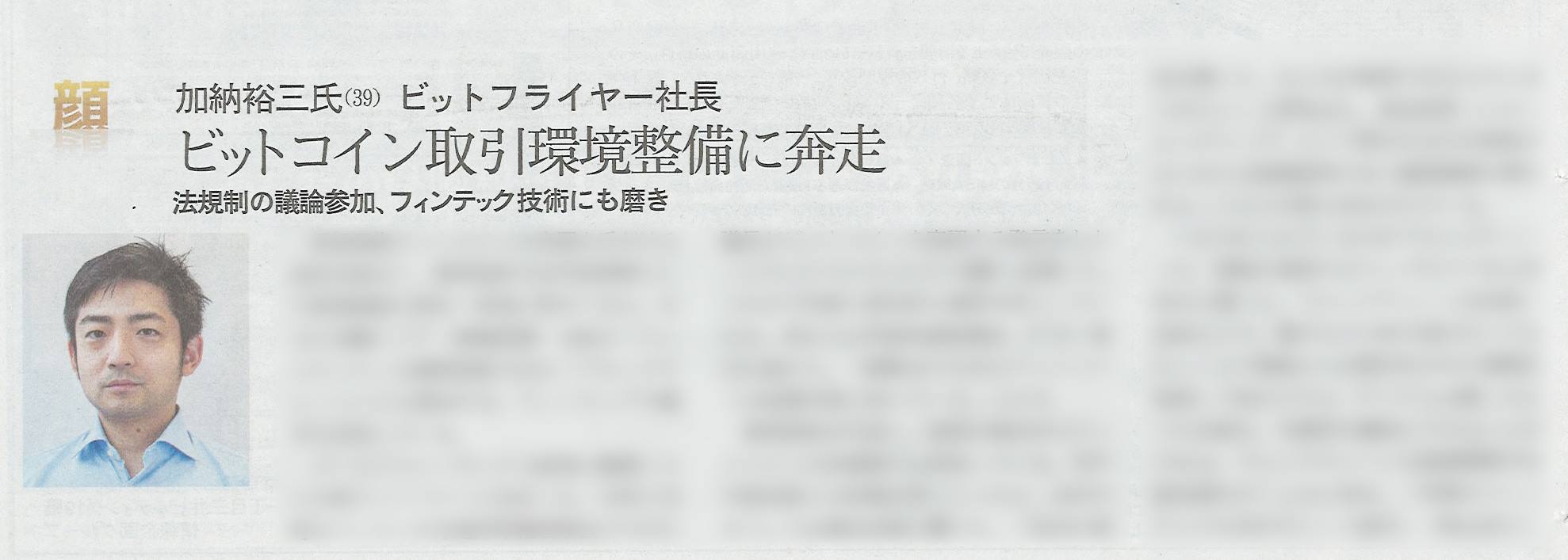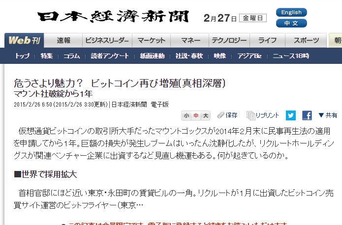 日本経済新聞朝刊で、弊社の資金調達に関する記事が掲載されました 国内最大手のビットコイン取引所を運営するビットフライヤー(東京・港)は25日、第三者割当増資を通じ約30億円の資金を調達した。金融とIT(情報技術)を融合したフィンテック企業では国内最大級の調達だ。 2016-04-26