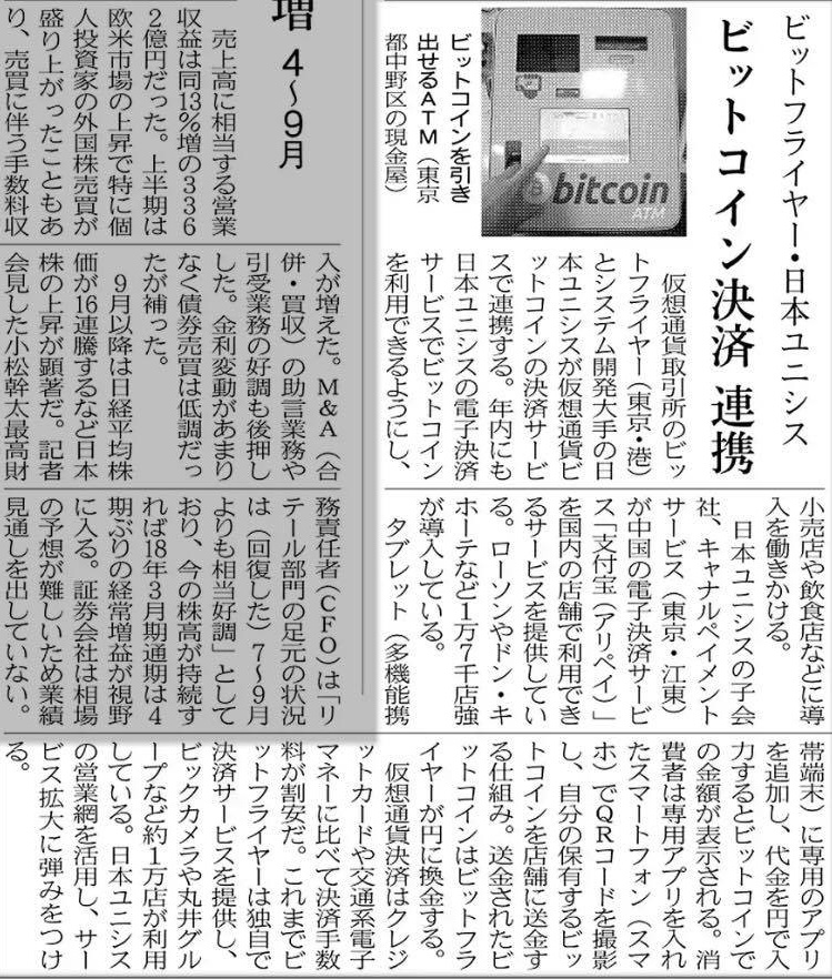 日経新聞記事「ビットコイン決済で連携 ビットフライヤーと日本ユニシス 」で当社と日本ユニシスの取組が紹介されました 仮想通貨取引所のビットフライヤーとシステム開発大手の日本ユニシスが仮想通貨ビットコインの決済サービスで連携する。年内にも日本ユニシスの電子決済サービスでビットコインを利用できるようにし、小売店や飲食店などに導入を働きかける。 2017-10-26