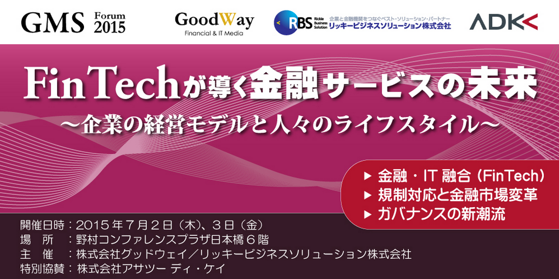 GMS2015~Fintechが導く金融サービスの未来~に加納が登壇致しました。 「Fintech革命が必要とする法規制とインフラ ~仮想通貨をめぐる動向と展望~」というテーマのパネルディスカッションに登壇させて頂きました。 2015-07-02