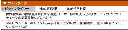 日経ヴェリタス第407号「ビットコイン取引環境整備に奔走 法規制の議論参加、フィンテック技術にも磨き」で弊社代表加納が取り上げられました。 仮想通貨ビットコインの売買を手がける会社を設立し、業界団体では代表理事として仮想通貨の普及・促進に努めてきた。さらに金融とIT(情報技術)を結ぶ「フィンテック」の基幹技術である「ブロックチェーン」にも進出する。フィンテックの旗手を自負している。 2015-12-27