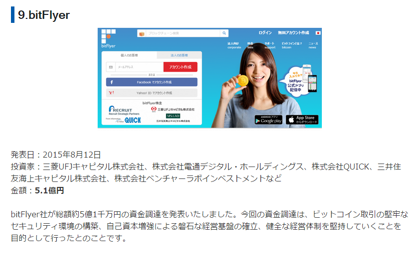 OFFICE LIFEの「日本のFINTECHベンチャー勢揃い。2016年版をカテゴリ別にまとめてみました。」に掲載されました ・bitFlyer 日本最大のビットコイン・ブロックチェーン事業者。2015年10月の月間取引額は18億円。ユーザー数は10万人を超えており、リクルートや三菱UFJキャピタル、三井住友海上キャピタル、GMOなどから総額8億円超の資金調達をしている。ユーザー数と資本金が日本最大である。 2016-01-13