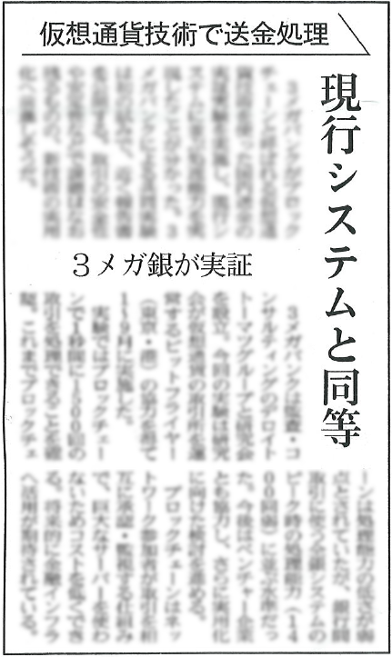 日経新聞記事「仮想通貨技術で送金処理 3メガ銀が実証」で弊社が取り上げられました 3メガバンクがブロックチェーンと呼ばれる仮想通貨技術を使った国内送金の実証実験を実施し、現行システムに並ぶ処理能力を実現したことが分かった。3メガバンクによる共同実験は初の試みで、近く報告書を公開する。取引の安全性や安定性などで課題はなお残るものの、新技術の実用化へ前進しそうだ。 2016-11-30