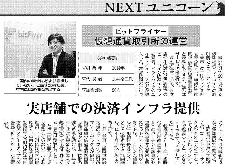 日経新聞記事「次のメルカリを探そう 変化先取りするスタートアップ企業は 」で当社が紹介されました 今や世界のビットコイン取引の半分を占める日本勢。大手取引所として急速に存在感を高めているのが、ビットフライヤーだ。中国の規制導入でビットコイン価格が乱高下した9月、ビットフライヤーで売買された額はレバレッジ取引を含めて約2兆円という規模だった。 2017-10-15