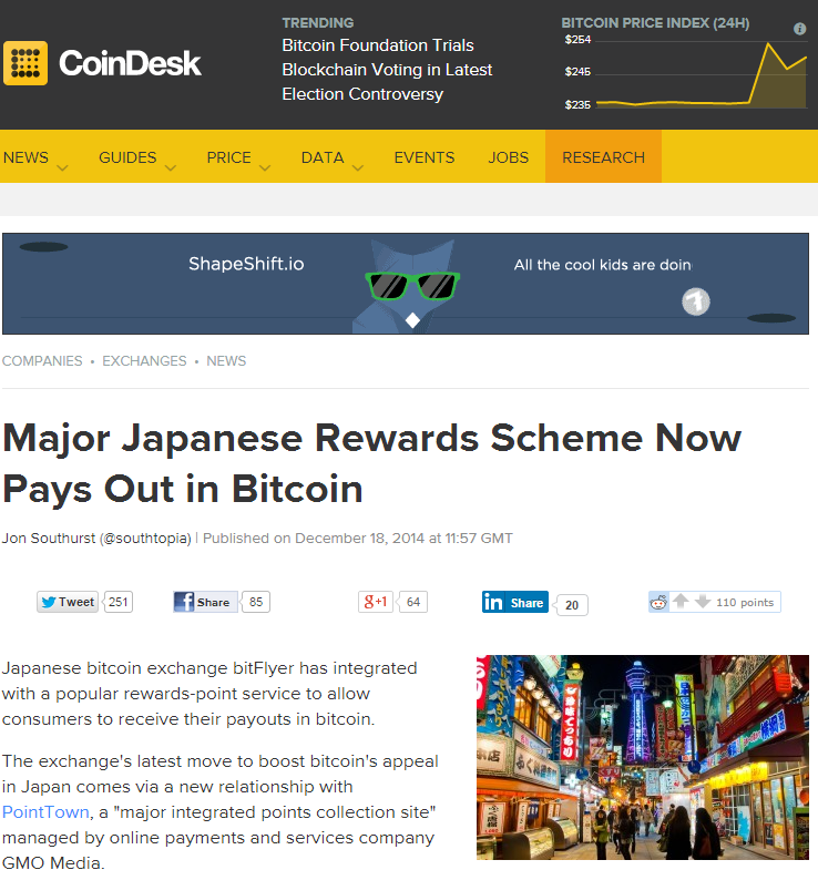 Major Japanese Rewards Scheme Now Pays Out in Bitcoin Japanese bitcoin exchange bitFlyer has integrated with a popular rewards-point service to allow consumers to receive their payouts in bitcoin. 2014-12-18