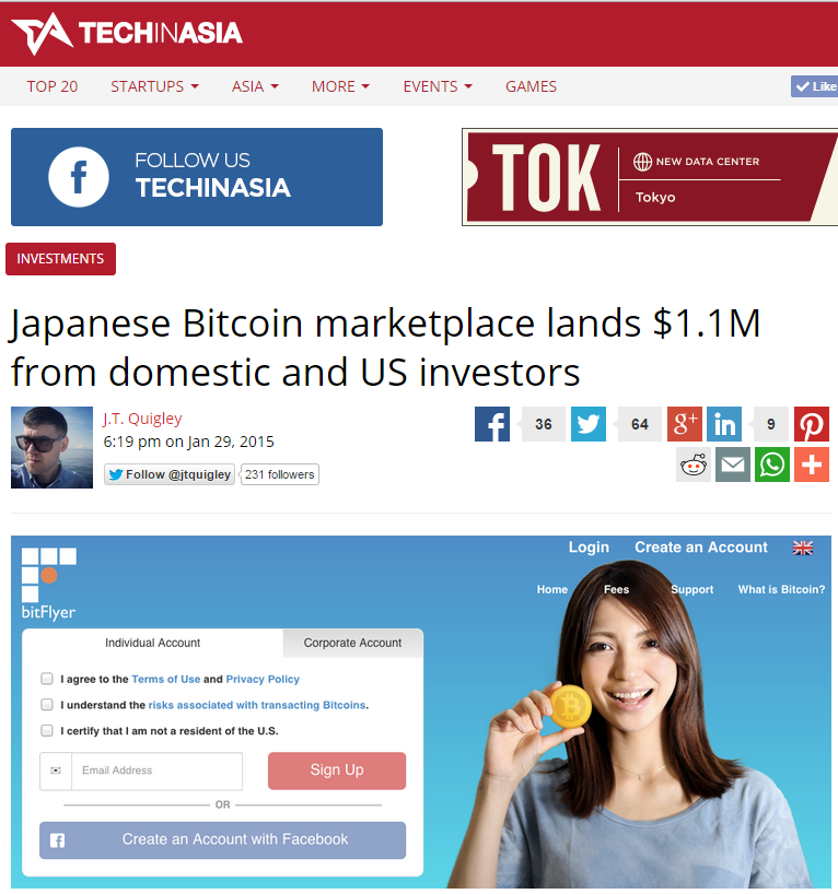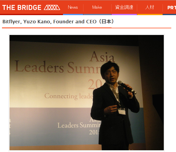 Tech in Asiaの”The 10 fintech companies in Japan you need to know”の記事において弊社が紹介されました Bitflyer is the largest bitcoin exchange in Japan. It has its own proprietary blockchain format, Chainflyer. Bitflyer is the number one bitcoin exchange market in Japan by trading volume. Founder and CEO Yuzo Kano is a supporter of the new economy but recognizes the importance of regulation. 2016-04-14