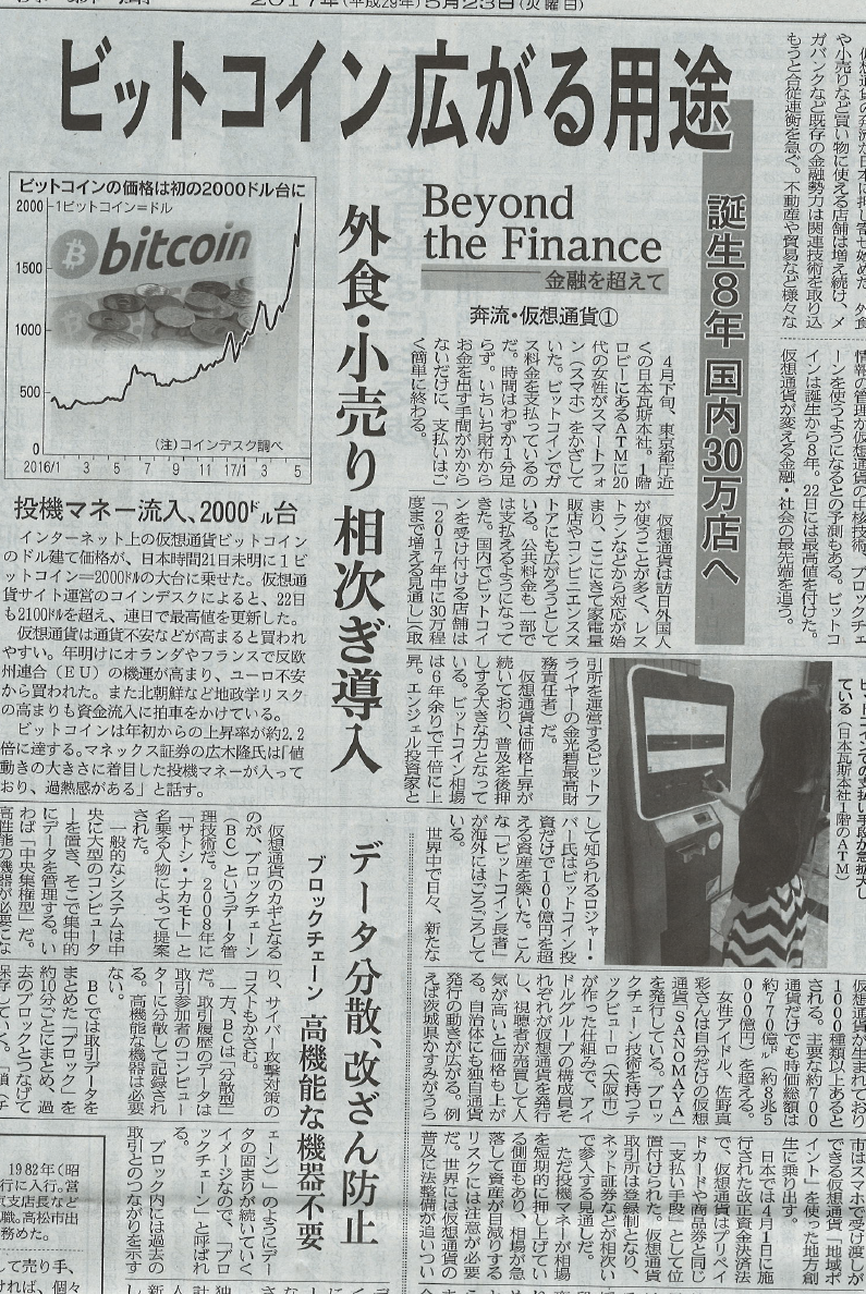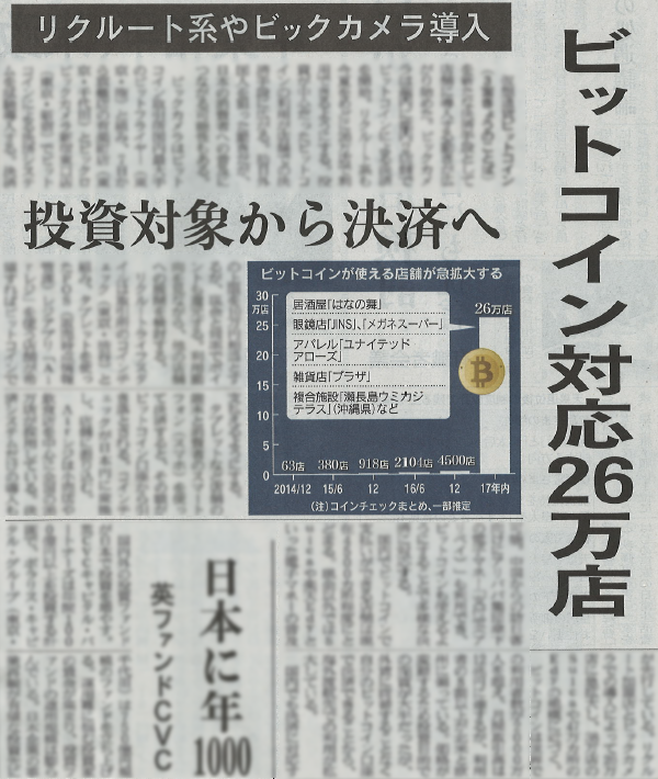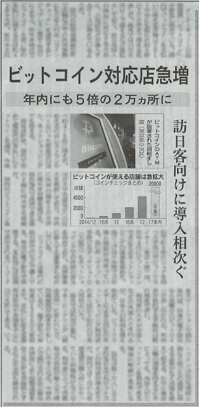 日経新聞記事「ビットコイン対応店舗急増」で弊社サービスが紹介されました インターネット上の仮想通貨「ビットコイン」が普及し始めている。国内でビットコインを支払いに使える店舗は2017年中にも現在の約5倍の2万カ所まで増える見通しだ。 2017-01-24