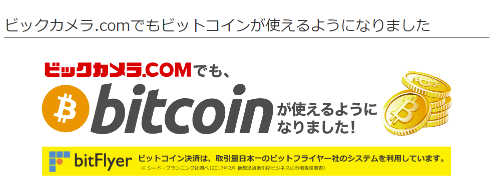 日経新聞記事「ビックカメラ、ネット通販でビットコイン決済対応」で当社とビックカメラの取組が紹介されました 家電量販大手のビックカメラ 13日から、自社のネット通販サイト「ビックカメラ・ドットコム」でビットコインによる決済に対応する。年末商戦を控え、店舗を利用しないビットコイン保有者を自社サイトに呼び込む狙いだ。 2017-12-13