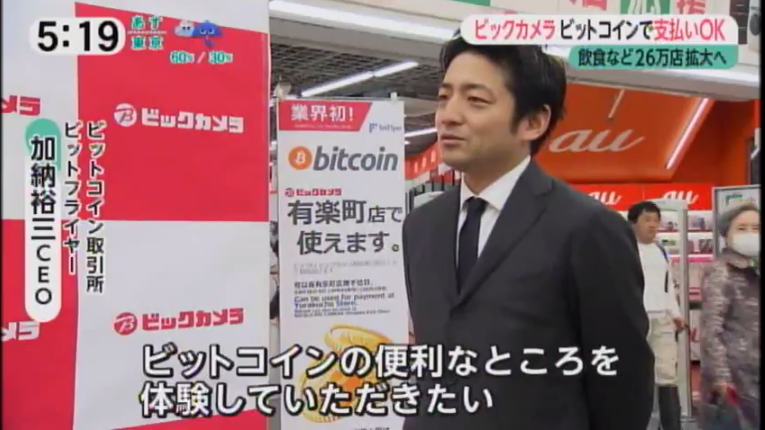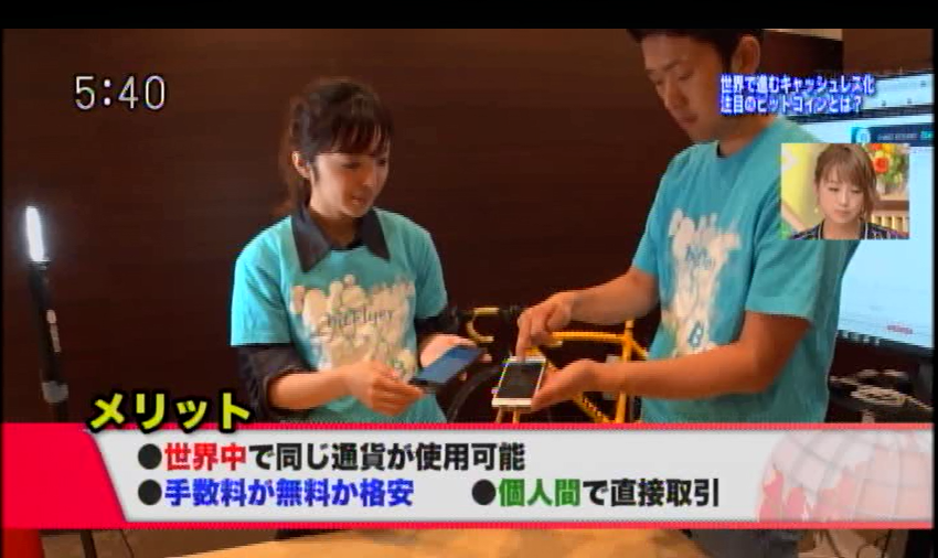 日本テレビヒルナンデス!でビックカメラでのビットコイン決済導入が紹介されました 日本テレビヒルナンデス!でビックカメラにおけるビットコイン決済導入が紹介されました。当社は決済サービスを提供しています。 2017-04-07