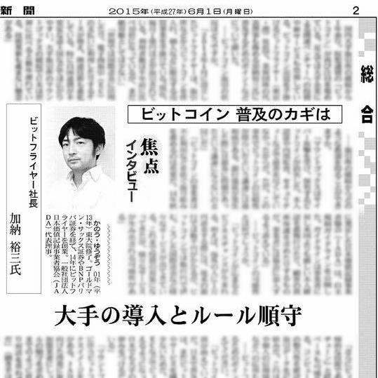 日経産業新聞(2015年6月1日)2面「焦点インタビュー」に掲載いただきました。 ビットコインの普及状況や、JADA(日本価値記録事業者協会)としての取り組みについて記載されています。 ご興味ある方、是非ご覧下さい。 2015-06-01