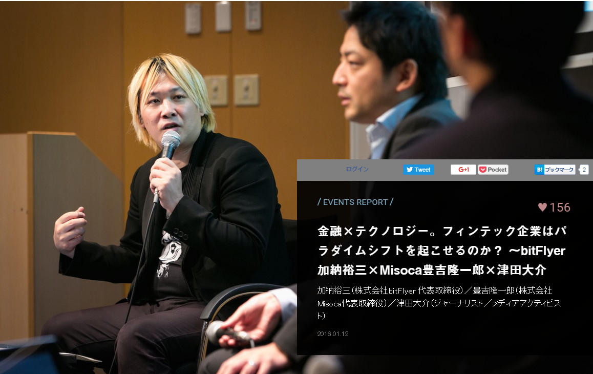 「FinTech ビジネスフォーラム ~新たな金融リテールサービスの創造と挑戦、FinTechスタートアップが金融機関に求めていること」に加納が登壇しました。 パネル「新たな金融リテールサービスの創造と挑戦 - 新しいユーザーエクスペリエンスとは?」ではパネリストとして、ZUU 代表取締役社長兼CEO 冨田 和成 氏、インフキュリオン 代表取締役 丸山 弘毅 氏、bitFlyer 代表取締役 加納 裕三 氏、MFS 代表取締役CEO 中山田 明 氏、インディ・パ 代表取締役 本郷 喜千 氏が登壇、グッドウェイ 代表取締役社長 藤野 宙志がモデレーターを務めた。 2015-11-02