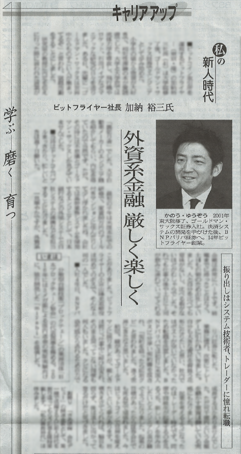 日経新聞「私の新人時代」で弊社代表加納が取り上げられました 私の新人時代 ビットフライヤー社長 加納裕三氏 外資系金融 厳しく楽しく ビットコイン取引所を運営するビットフライヤー(東京・港)の加納裕三社長(41)は大学院修了後、ゴールドマン・サックス証券でエンジニアとして歩み始めた。 2017-01-31