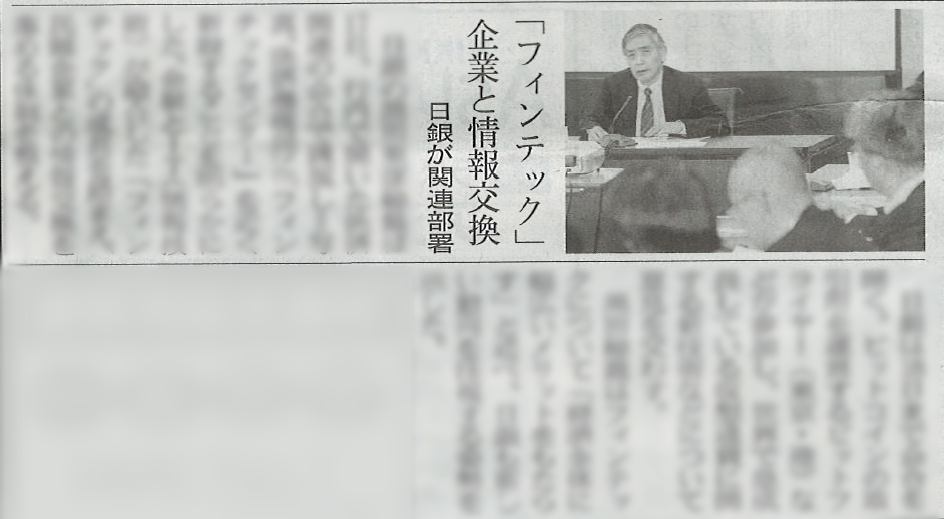 日本経済新聞『「フィンテック」企業と情報交換』で、弊社の記事が掲載されました 黒田総裁はフィンテックについて「経済全体に幅広いメリットをもたらす」と述べ、日銀も新しい動向を注視する姿勢を示した。 2016-03-18