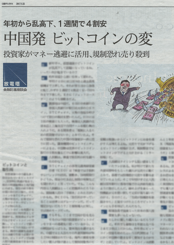 日経ヴェリタス記事「中国発 ビットコインの変」で弊社代表加納のコメントが取り上げられました 年初から乱高下、1週間で4割安 中国発 ビットコインの変。 投資家がマネー逃避に活用、規制恐れ売り殺到。 2017-01-22
