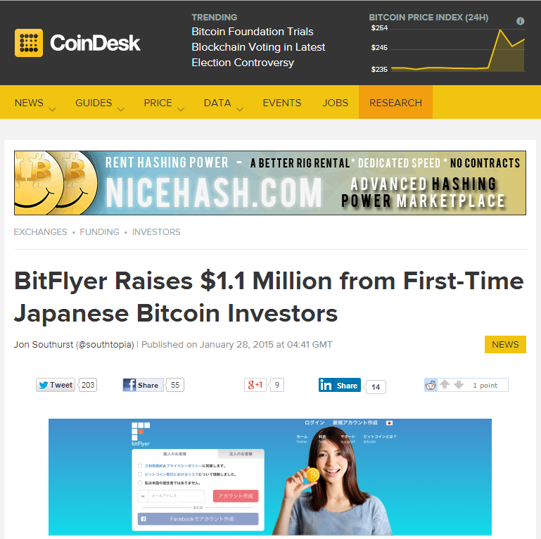 BitFlyer Bitcoin Exchange Gets $236,000 to Expand Overseas BitFlyer Inc., a Japanese bitcoin exchange, raised 25 million yen ($236,000) from New York-based Bitcoin Opportunity Corp. to fund its overseas expansion. 2014-10-16 Bloomberg