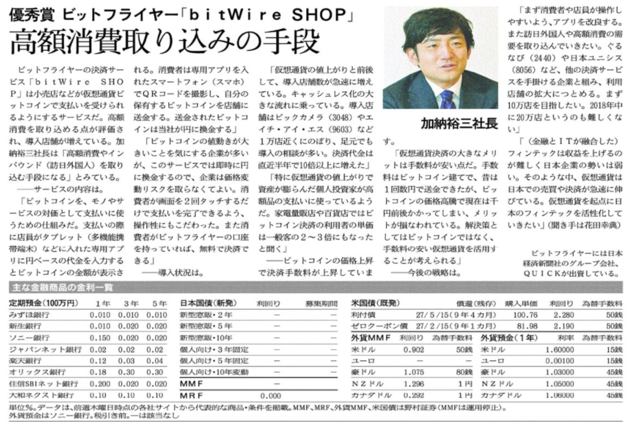 当社のビットコイン決済サービス「bitWire SHOP」が日経ヴェリタス賞の優秀賞に選出されました 日本経済新聞社のグループ会社、QUICKがビットフライヤーに出資している。小売店などがビットコインで支払いを受けられるようにするサービスだ。仮想通貨は高額決済の場合、クレジットカードなどに比べ決済手数料が安い。訪日外国人の消費を取り込む手段になる。1万店弱が導入。 2018-01-04