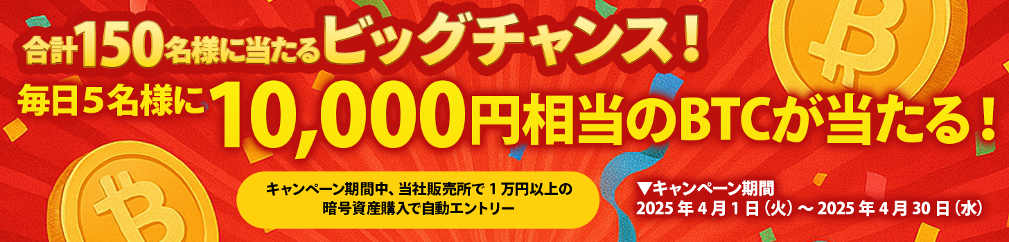 キャンペーン期間中、条件を満たしたお客様の中から抽選で毎日 5 名様(合計 150 名様)に 10,000 円相当の BTC をプレゼントいたします。