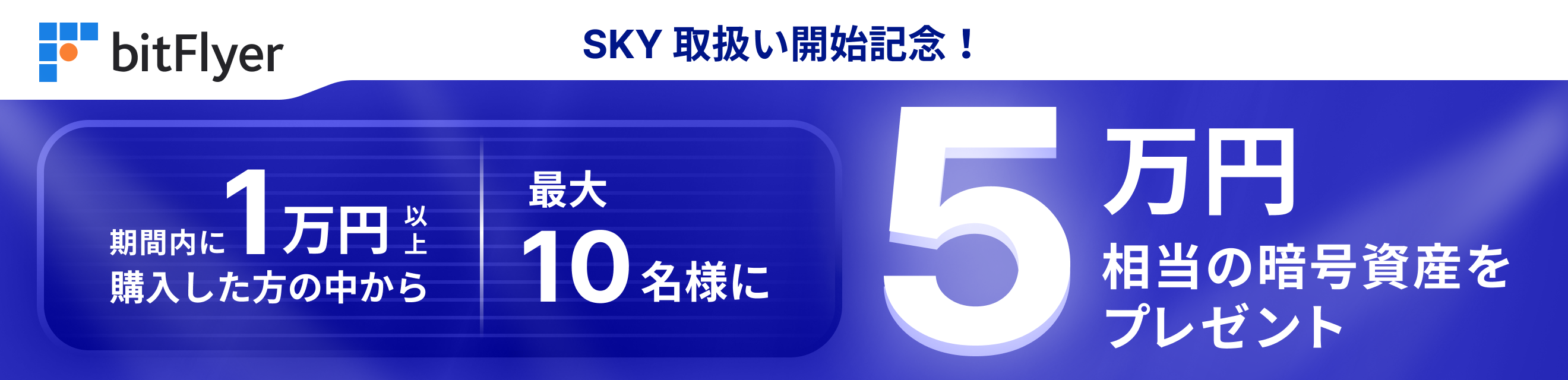 ビットフライヤーは新たに販売所で SKY の取り扱いを開始しました。これを記念し、期間中、当社販売所で SKY を 1 万円以上ご購入いただいた方の中から、抽選で最大 10 名様に 5 万円相当の SKY(現物)をプレゼントいたします。