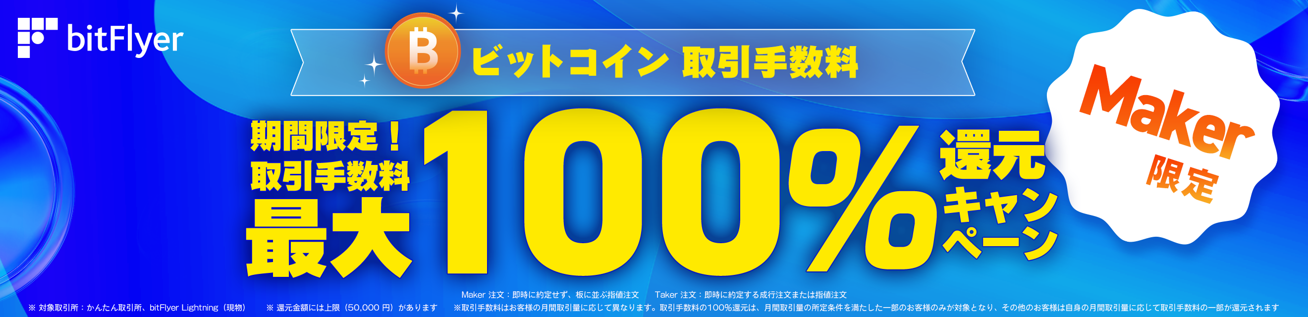ビットフライヤーでは、期間限定で、取引所*においてMaker 注文が約定したお客様を対象に取引手数料を最大 100% 還元するキャンペーンを実施いたします。