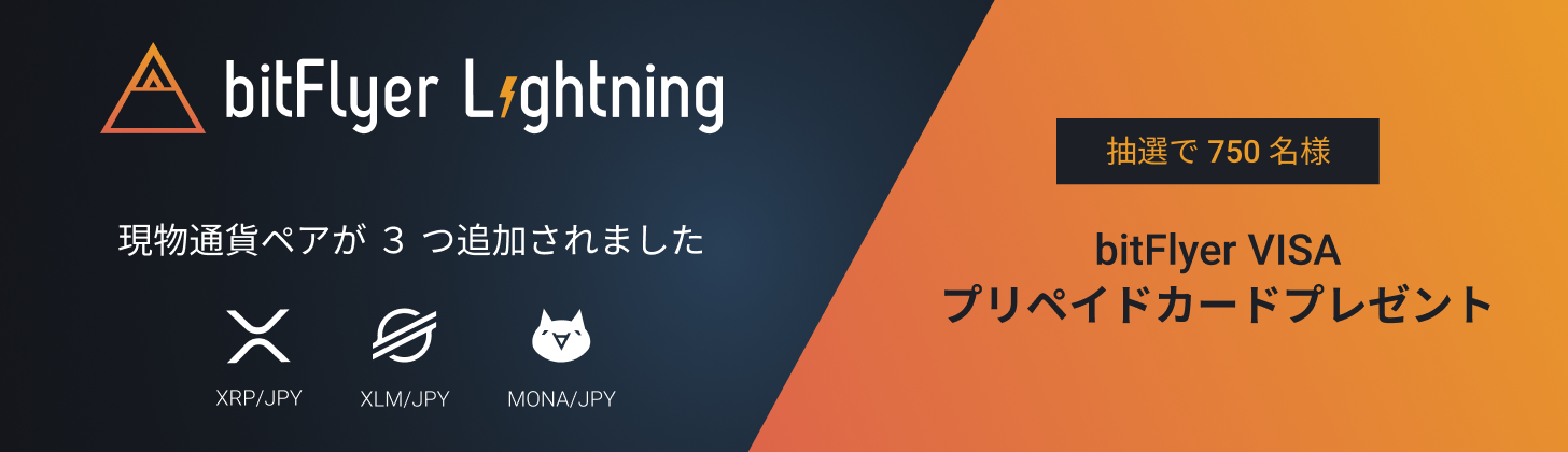 2021 年 4 月 1 日より bitFlyer Lightning に XRP/JPY、XLM/JPY、MONA/JPY ペアが新たに追加されました。これを記念して、条件を満たしたお客様のうち抽選で 750 名様にbitFlyer VISA プリペイドカードをプレゼントします。