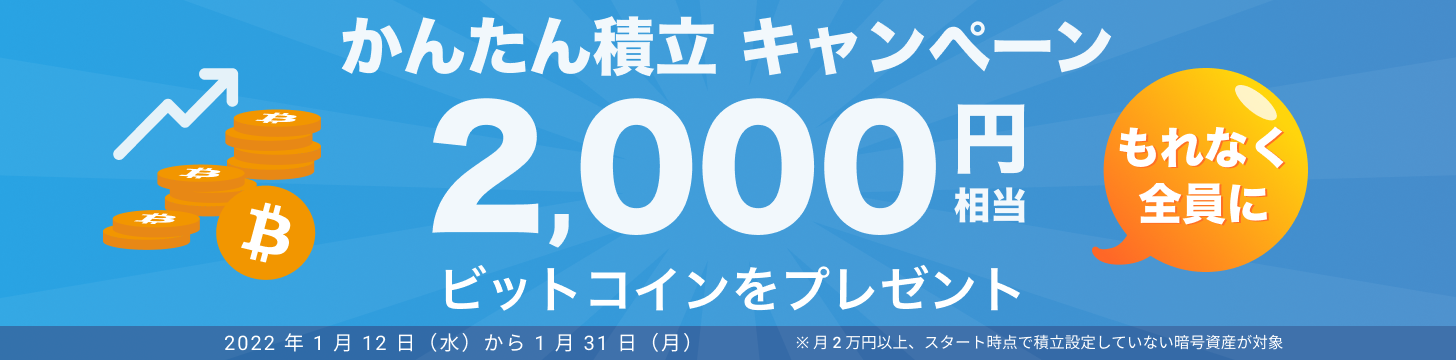 キャンペーン期間中にエントリ―して、新しく 1 通貨あたり月 2 万円以上の積立設定をし、3 ヶ月継続した方全員に、もれなく 2,000 円相当のビットコインをプレゼントします。