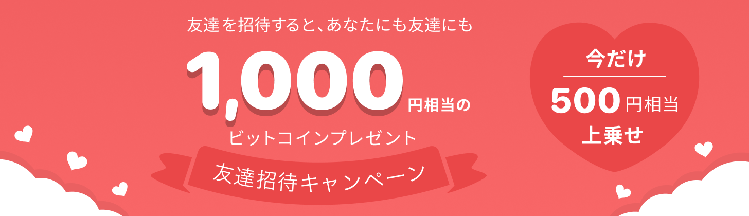 本キャンペーンにエントリーいただくと、キャンペーン期間中は、招待した方に 500 円相当のビットコインを上乗せしてプレゼントします。招待人数に上限はありません。
