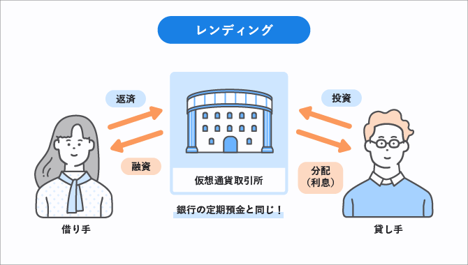 レンディングとは、あらかじめ期間を決めて DeFi プラットフォームに資産を預け入れ、満期になると利息とともに返金されるというもので、銀行の定期預金と似た取引です。