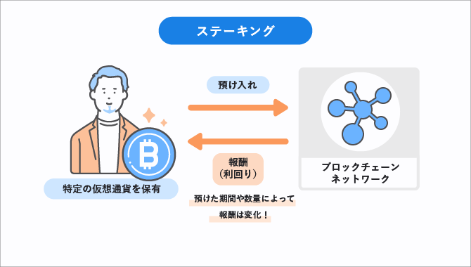 ステーキングとは、特定の暗号資産を一定量以上預け入れ、ブロックチェーンに参加することで、報酬を得る仕組みのこと。どれほどの量の暗号資産をどれほど長く保有したかによって、報酬の多寡が変わってきます。
