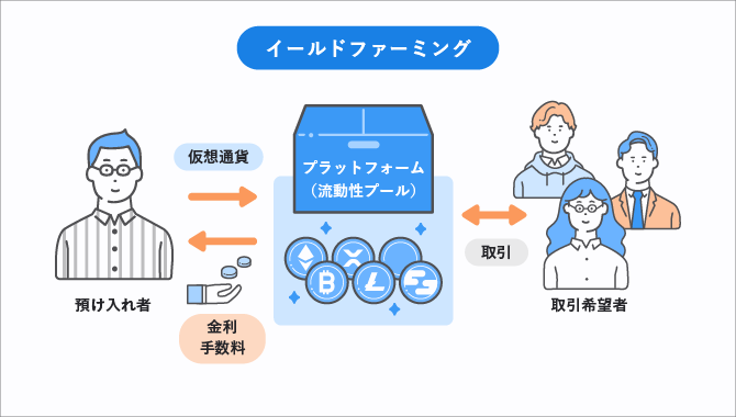 イールドファーミングとは、参加者が DeFi サービスに手持ちの暗号資産を預けて流動性を提供することにより、金利や手数料を得る仕組みのことです。元来、DeFi は管理者がいないためにまとまった資産を用意しにくく、大きな取引がしにくい…つまり、「流動性が低い」という欠点がありました。